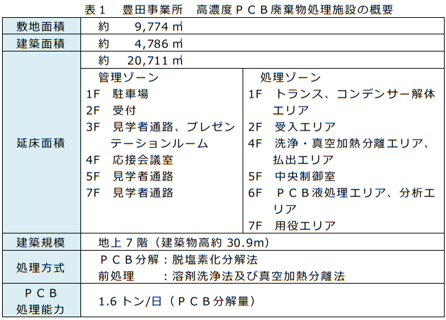今後解体撤去する豊田事業所の施設の概要を表1に示す。平成17年9月に操業を開始し、主に東海4県(岐阜県、静岡県、愛知県、三重県)に保管されていた高濃度PCB廃棄物と関西4県2府(滋賀県、京都府、大阪府、兵庫県、奈良県、和歌山県)の高濃度PCB含有コンデンサーの一部の処理を行ってきた。