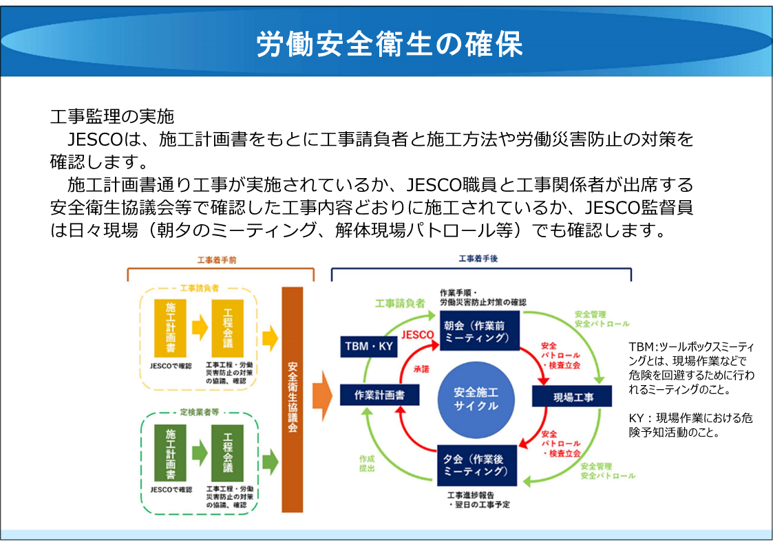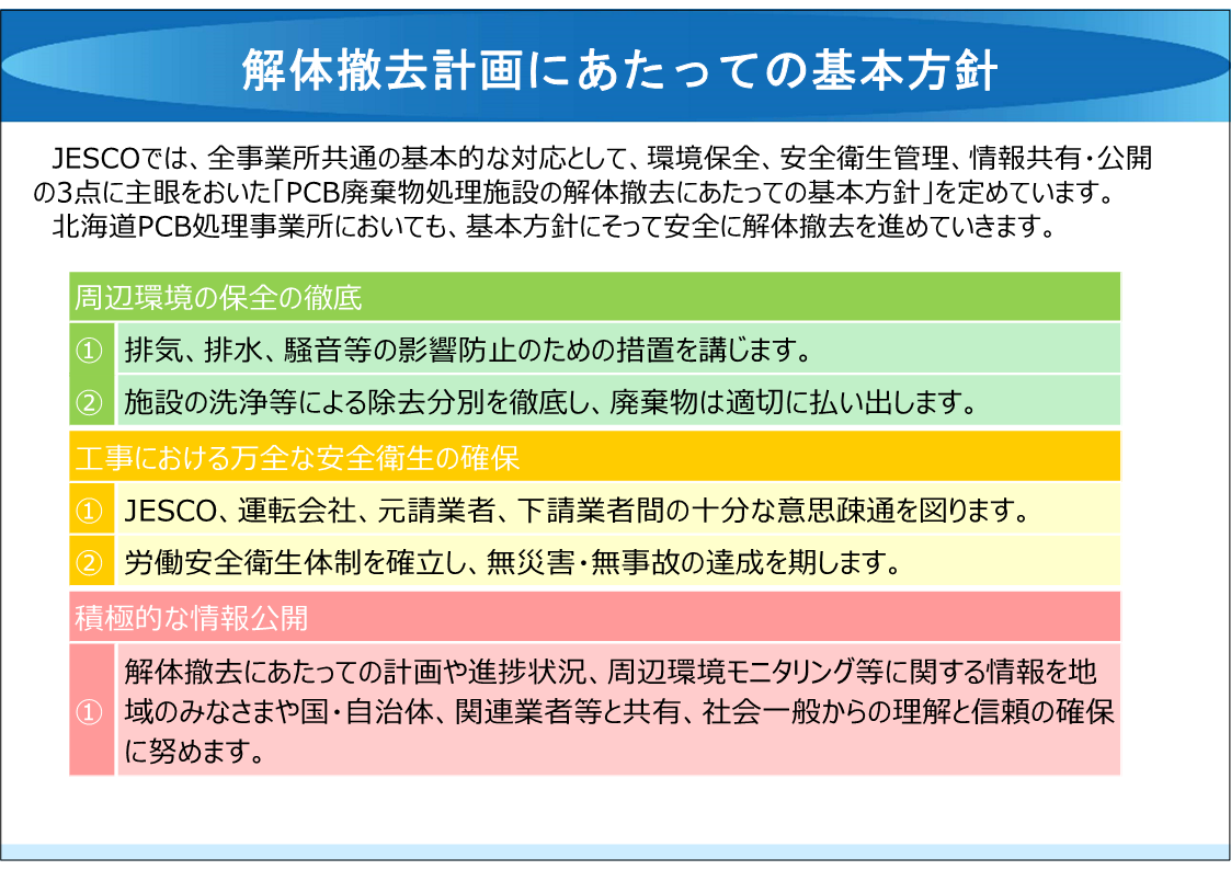 この基本方針では、JESCO施設の解体撤去にあたって環境の保全、安全衛生及び情報共有・公開の3点に主眼をおいた規定を定めています。