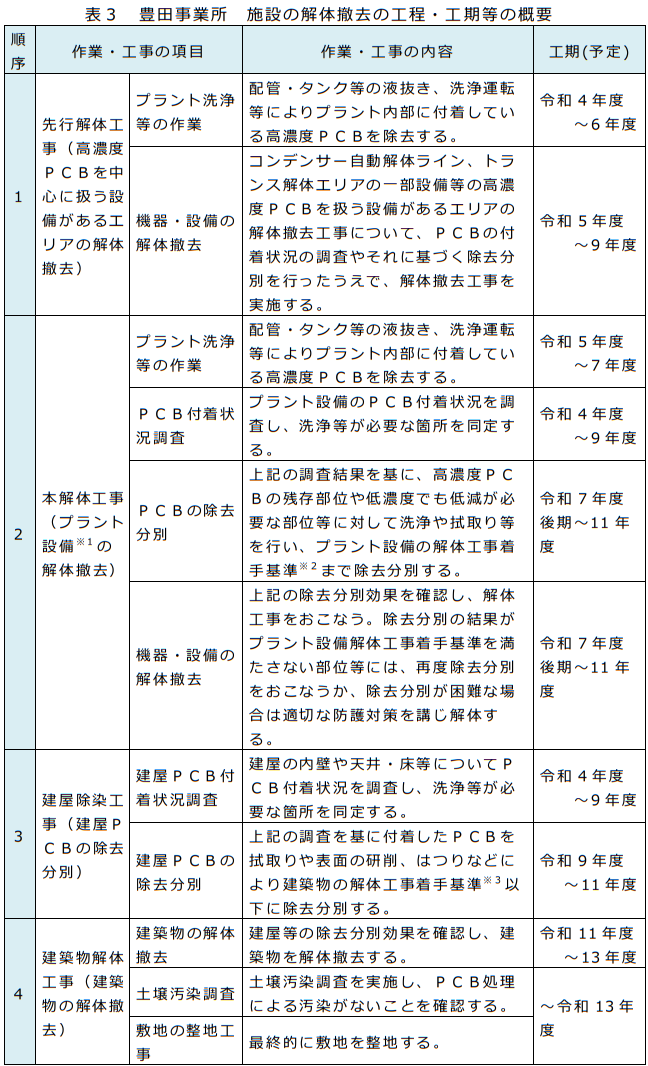 豊田事業所のPCB処理施設の解体撤去は、表3に示すように概略4つの工程区分に分けて実施する予定である。